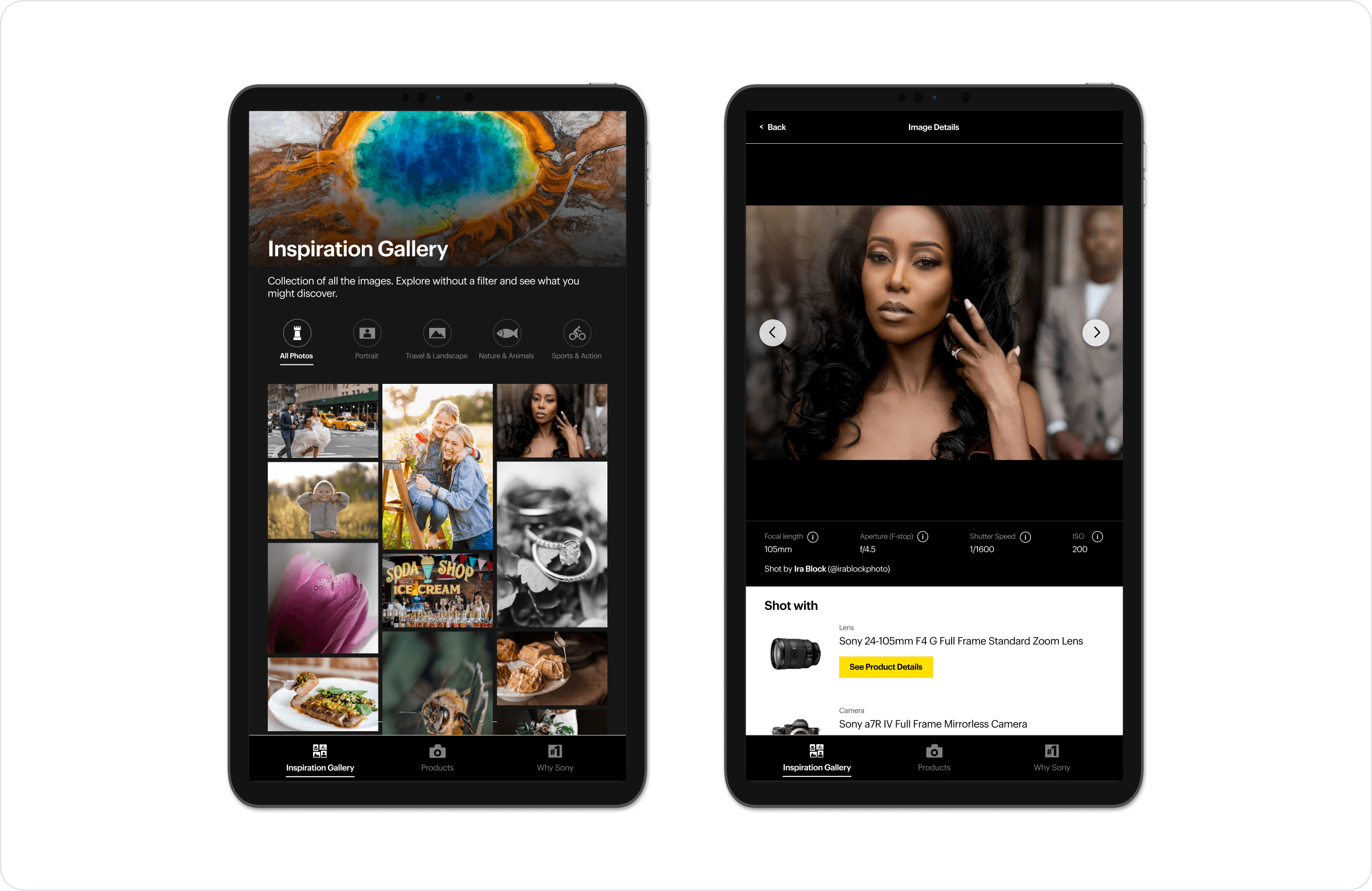 I led the design of a new interactive touchscreen experience to help novice photographers choose camera gear and accessories tailored to their needs.