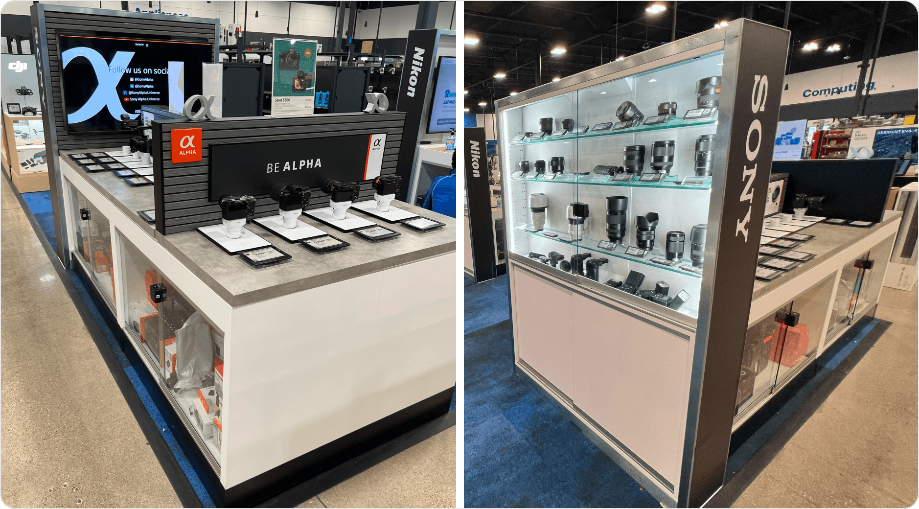 The Sony Lens Totem Display at Best Buy featured a 3-sided demo table and a lens cabinet filled with shelves of lenses. While the display was functional, it lacked educational or engaging elements for customers to learn more about the products.