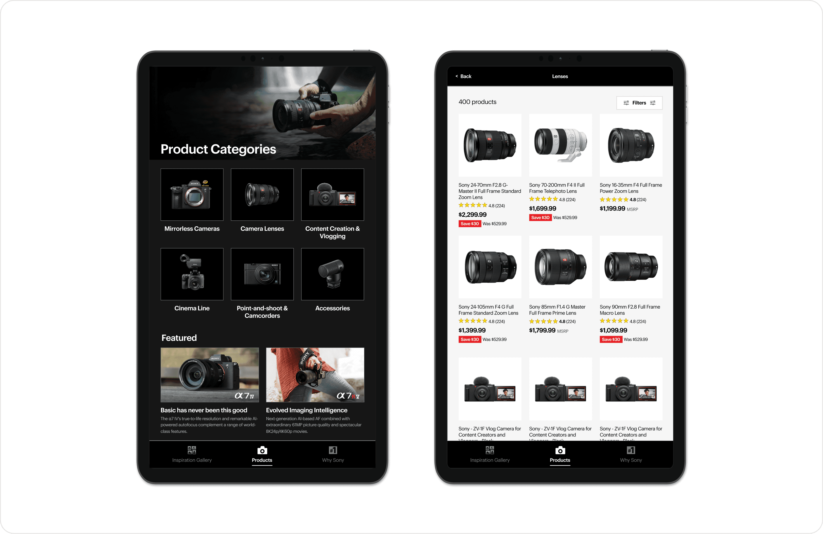 See below for our survey results. These insights highlighted the need for an interactive touchscreen to provide informative and inspirational content to simplify the decision-making process. We integrated a 27" interactive touchscreen into the lens cabinet side of the Sony Lens Totem, reducing its shelving space by half to make room for the new interactive feature.